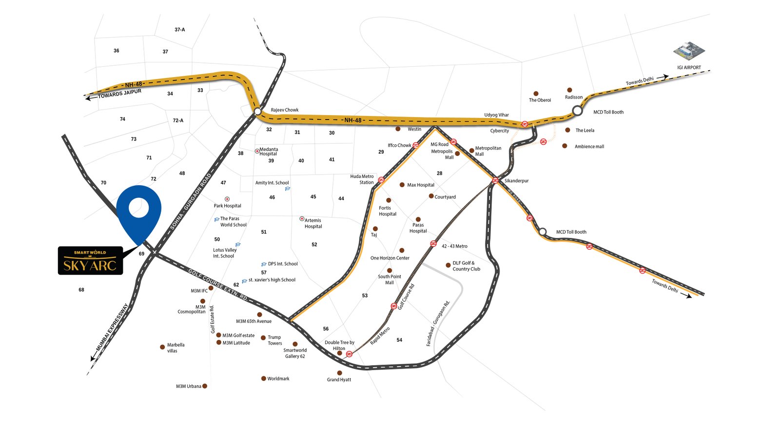 Sky Arc Sector 69 is strategically located on SPR Road, Gurgaon, providing excellent connectivity to key areas of the city while offering a serene and elevated living environment.